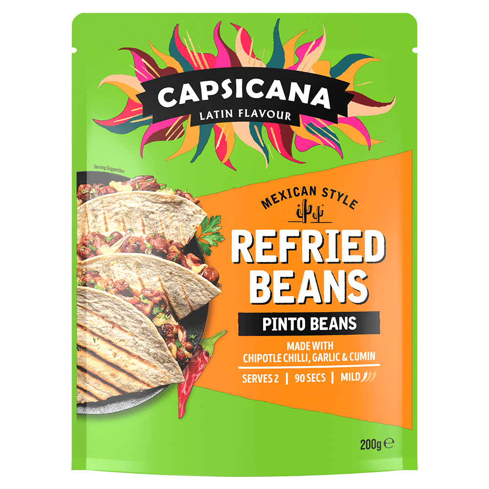 This is our twist on the classic refried beans from Northern Mexico. We season pinto beans with a blend of garlic and cumin. Ready in 90 secs, perfect for filling quesadillas for a quick lunch, rolling up in a burrito, pilling onto loaded nachos or as a side dish.