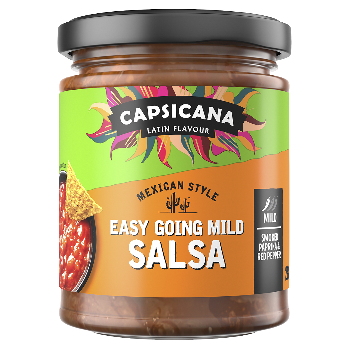Our Easy Going Mild Salsa has a smoky flavour with a little kick of heat. It is perfect for dipping in chips or dolloping on your favourite fajita.
