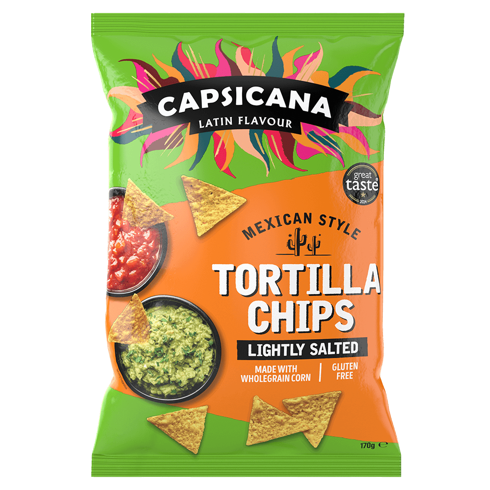 Our crunchy Capsicana Tortilla Chips contain just three ingredients - wholegrain corn, sunflower oil and a little salt. We make them using the traditional Mexican method called "nixtamalization". The corn is soaked, dried and stoneground, then made into masa dough which is cut, flash-fried and lightly salted. Bringing you a bag-full of authentic corn crunch and flavour. They taste great on their own, with salsa and guacamole or made into nachos.
