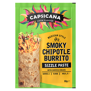 Bring Mexico’s vibrant culture to your table with this tomato & chipotle burrito, inspired by the shredded chicken dish Tinga which originates from Puebla in Mexico. It has a smoky flavour with just enough heat from the chipotle married with sweet tomatoes, which is a real crowd pleaser. Roll it up in a warmed tortilla with rice and toppings and you’re good to go in less than 15 mins.