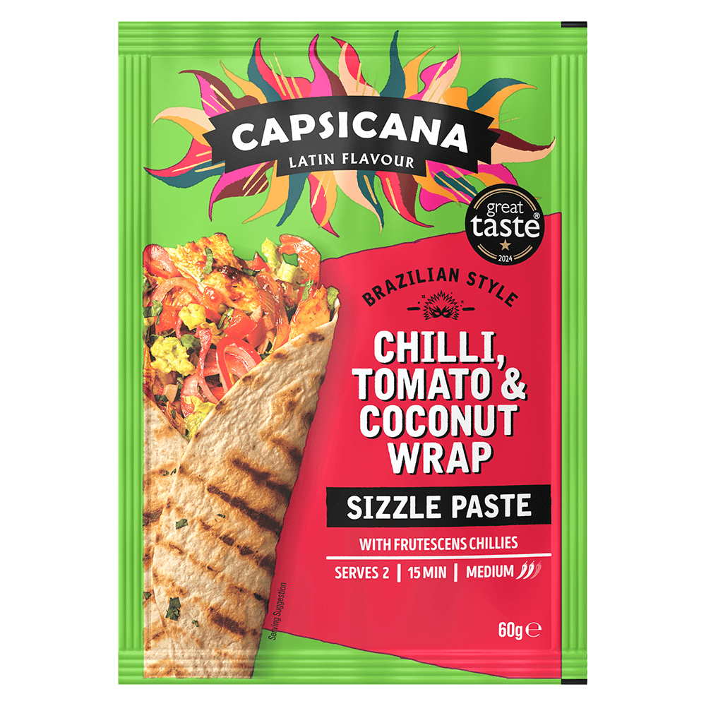 Tear open this cooking paste, you’ll instantly be transported to the sunny and colourful streets of Brazil. Inspired by the classic dish “Moqueca” from Bahia State just north of Rio and created a unique blend of tomato paste, frutescens chillies and coconut milk to create a fragrant fusion. Team up with chicken and vegetables, roll it up in a warmed tortilla wrap and you’re good to go in less than 15 mins