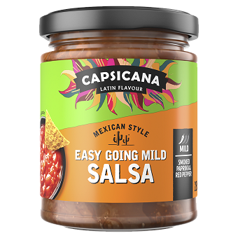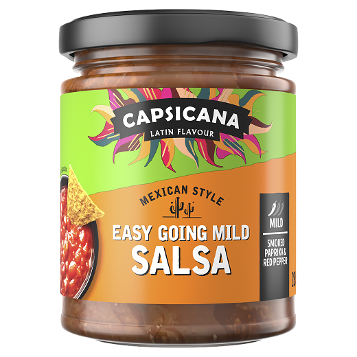 Our Easy Going Mild Salsa has a smoky flavour with a little kick of heat. It is perfect for dipping in chips or dolloping on your favourite fajita.